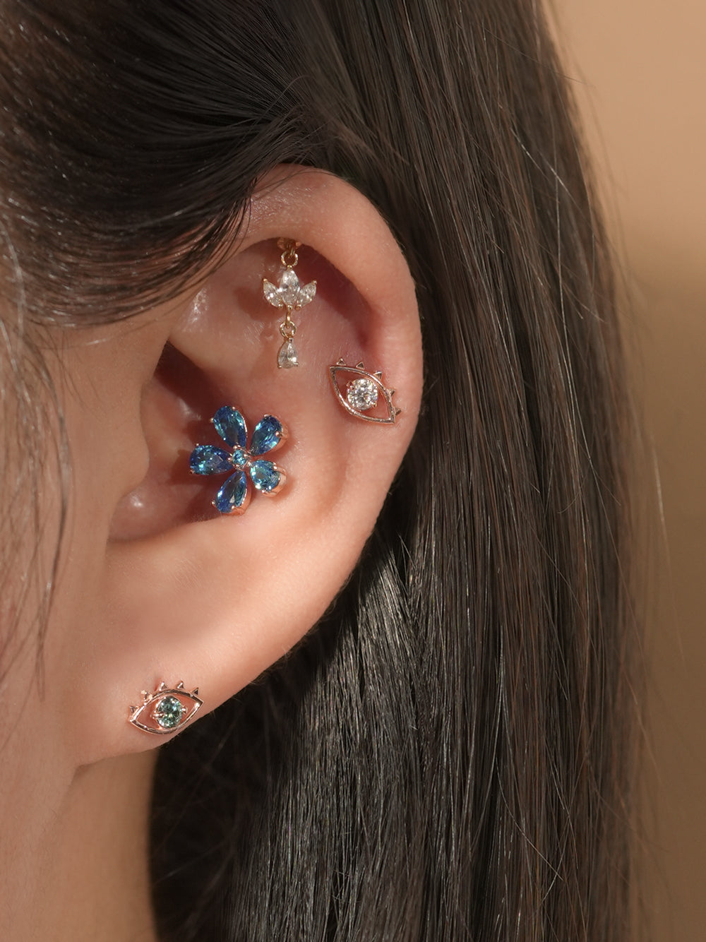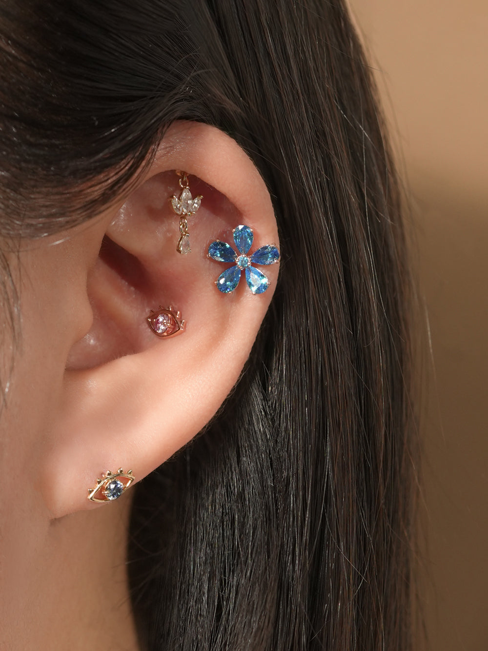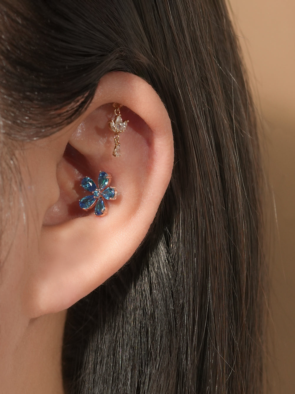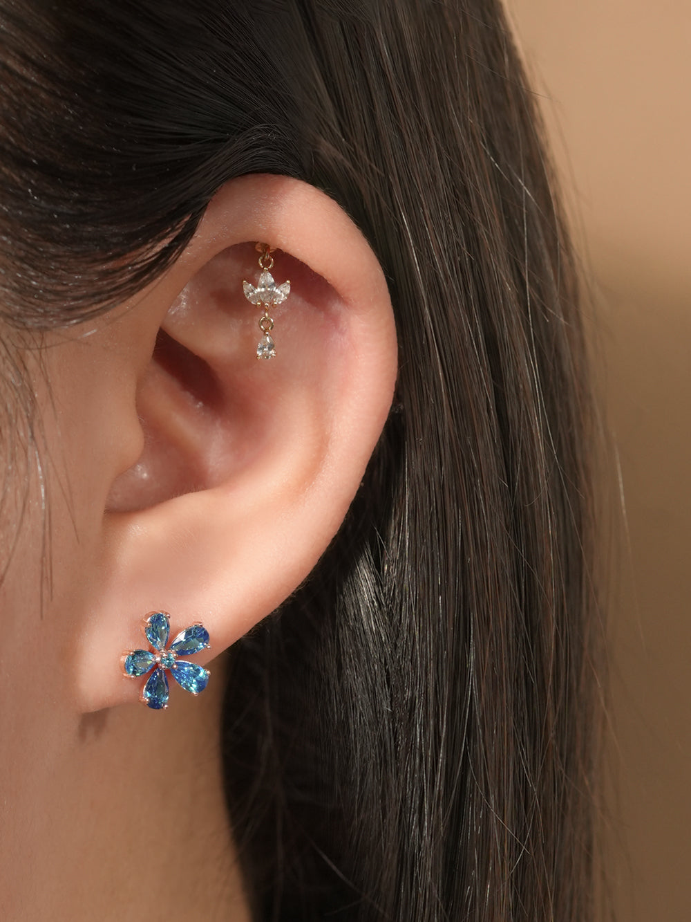 14K Gold Blue Topaz Flower Cartilage Earring 20G18G16G