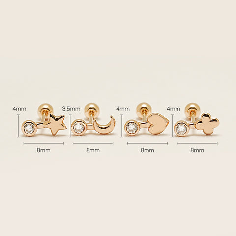 14K Gold Symbol Star, Cresent, Heart and Clover Cartilage Earring 20G18G16G